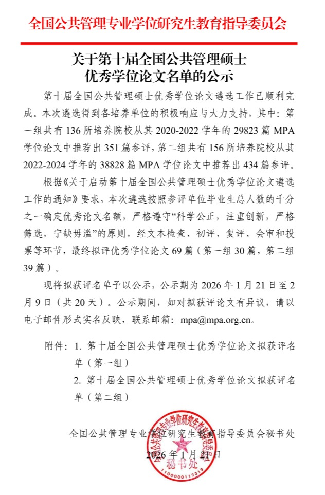 全国MPA优秀学位论文评选是国内公共管理专业学位领域层次最高、含金量最足、影响力最大的评选活动,代表着我国MPA研究生教育的顶尖水准。本届评选覆盖全国近300所MPA培养单位,从2020-2024学年超6.8万篇学位论文中初筛785篇进入参评环节,经文本审核、专家评审、综合会审等多轮严格遴选,最终69篇获评优秀。我校两篇论文凭借扎实的研究基础、鲜明的问题导向与突出的实践价值,在激烈竞争中脱颖而出,充分彰显了我院MPA人才培养的过硬实力。