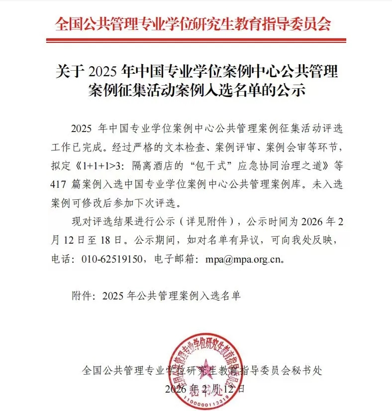 近日,全国公共管理专业学位研究生教育指导委员会公布2025年中国专业学位案例中心公共管理案例库入选名单,我院4篇专业教学案例成功入选。此次入选的4篇案例由学院骨干教师团队打造,分别为张广科老师团队撰写的《新乡贤归巢记:如何从“有才有财”到“有为有治”?》、李云新老师团队撰写的《昔日“臭水塘”何以引来百鸟来栖?》、杨朦老师团队撰写的《从技术乌托邦到智能社会:数智技术如何穿过社会迷雾?》、杨起城老师团队撰写的《跨越时光的关怀:S社区时间银行互助养老模式成长记》。 “中国专业学位案例中心”是由教育部学位与研究生教育发展中心牵头建设的国家级、综合性案例资源库与教学服务平台,其案例收录情况已作为专业学位